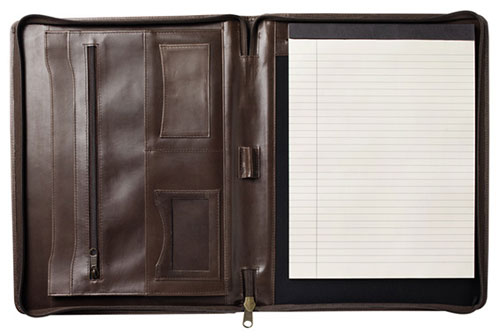 zippered closure  |  two paper storage pockets   |  zipper storage pocket   |  clear id window   |  card pocket   |  pen holder   |  ruled letter paper