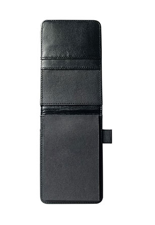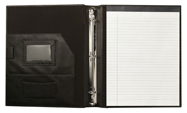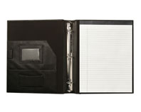 paper storage pocket | clear id window | card pocket | pen holder | lined letter pad
