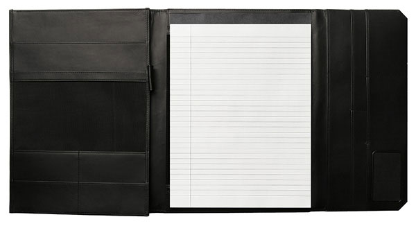 paper storage pocket | clear id window | card pocket | pen holder | lined letter pad