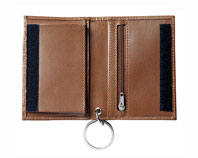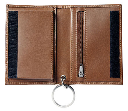 outside clear id window | key ring | velcro closure | inside zip pocket | card pockets